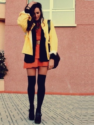 Kaos kaki sing dhuwur ngidini sampeyan nggawe gambar romantis. Padha becik nglengkapi gandha kanthi gaun cendhak sing anget, ing sisih endhasé rada suar. Gamelan feminin katon banget, ing endi dawa sing dirajut utawa wulu kanthi lengen lan kancing werna alam.